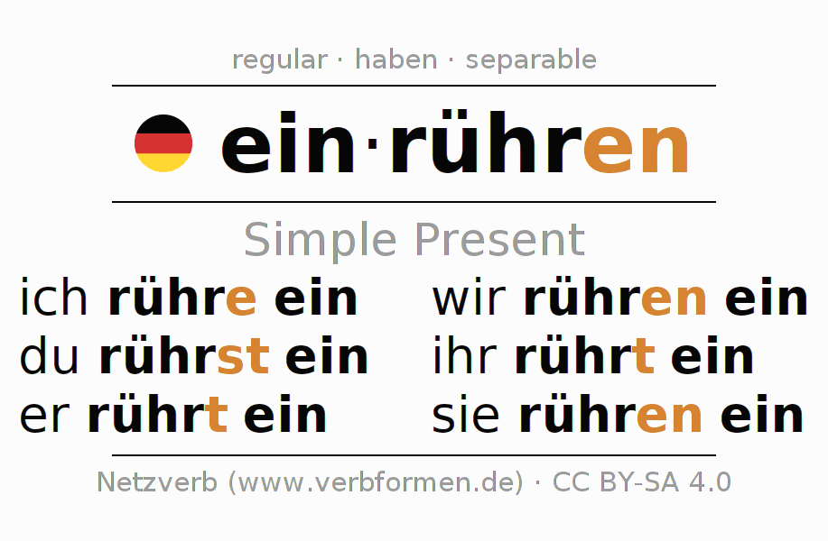 The conjugation of einrühren (mix, stir) in the present tense is: ich rühre ein, du rührst ein, er rührt ein, wir rühren ein, ihr rührt ein, sie rühren ein. For this purpose, the endings -e, -st, -t, -en, -t, -en are appended to the stem rühr. The prefix ein- of einrühren is separated.The formation of the forms corresponds to the grammatical rules for the conjugation of the verbs in the present tense. Comments ☆
