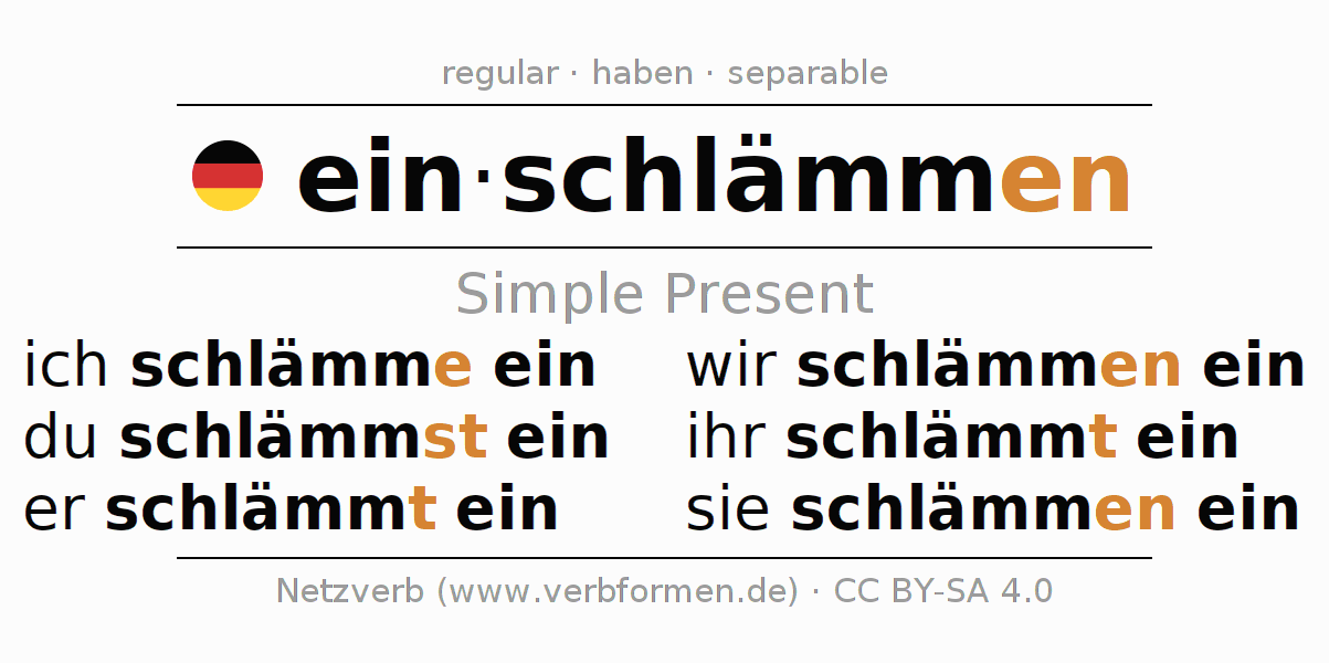 The conjugation of einschlämmen (water, soak) in the present tense is: ich schlämme ein, du schlämmst ein, er schlämmt ein, wir schlämmen ein, ihr schlämmt ein, sie schlämmen ein. For this purpose, the endings -e, -st, -t, -en, -t, -en are appended to the stem schlämm. The prefix ein- of einschlämmen is separated.The formation of the forms corresponds to the grammatical rules for the conjugation of the verbs in the present tense. Comments ☆