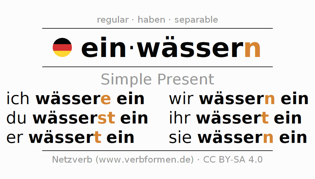 The conjugation of einwässern (macerate, irrigate) in the present tense is: ich wäss(e)re ein, du wässerst ein, er wässert ein, wir wässern ein, ihr wässert ein, sie wässern ein. For this purpose, the endings -e, -st, -t, -n, -t, -n are appended to the stem wässer. The endings in the 1st and 3rd person plural are shortened by "e", since the verb ends with -ern. The prefix ein- of einwässern is separated.The formation of the forms corresponds to the grammatical rules for the conjugation of the verbs in the present tense. Comments ☆
