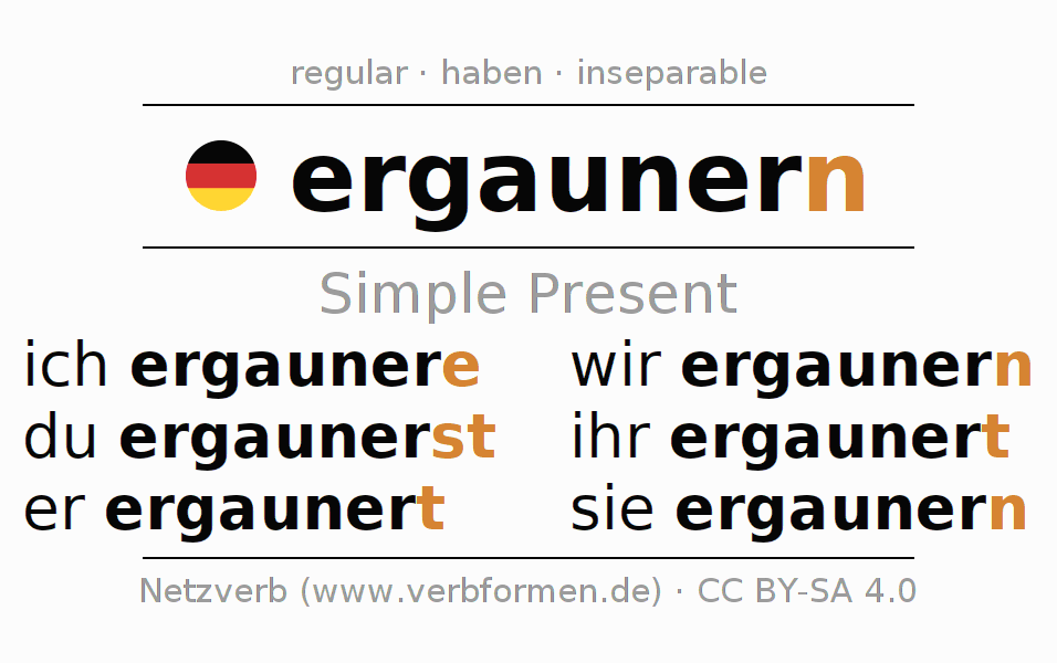 The conjugation of ergaunern (grift, cheat) in the present tense is: ich ergaun(e)re, du ergaunerst, er ergaunert, wir ergaunern, ihr ergaunert, sie ergaunern. For this purpose, the endings -e, -st, -t, -n, -t, -n are appended to the stem gauner. The endings in the 1st and 3rd person plural are shortened by "e", since the verb ends with -ern. The formation of the forms corresponds to the grammatical rules for the conjugation of the verbs in the present tense. Comments ☆