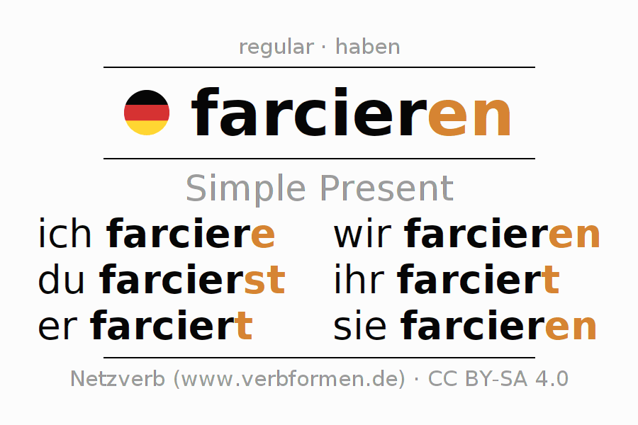 The conjugation of farcieren (fill, staff) in the present tense is: ich farciere, du farcierst, er farciert, wir farcieren, ihr farciert, sie farcieren. For this purpose, the endings -e, -st, -t, -en, -t, -en are appended to the stem farcier. The formation of the forms corresponds to the grammatical rules for the conjugation of the verbs in the present tense. Comments ☆