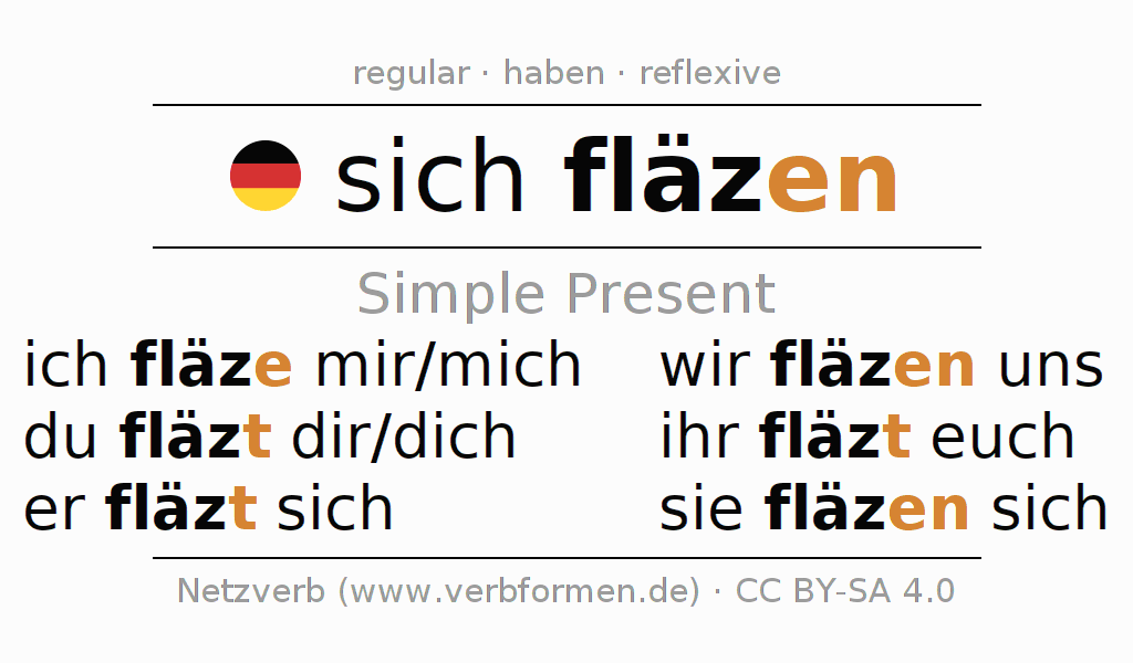 The conjugation of sich fläzen (lounge, sprawl) in the present tense is: ich fläze mir/mich, du fläzt dir/dich, er fläzt sich, wir fläzen uns, ihr fläzt euch, sie fläzen sich. For this purpose, the endings -e, -t, -t, -en, -t, -en are appended to the stem fläz. The ending in the second person singular is shortened by "s", since the stem already ends on -z. The formation of the forms corresponds to the grammatical rules for the conjugation of the verbs in the present tense. Comments ☆