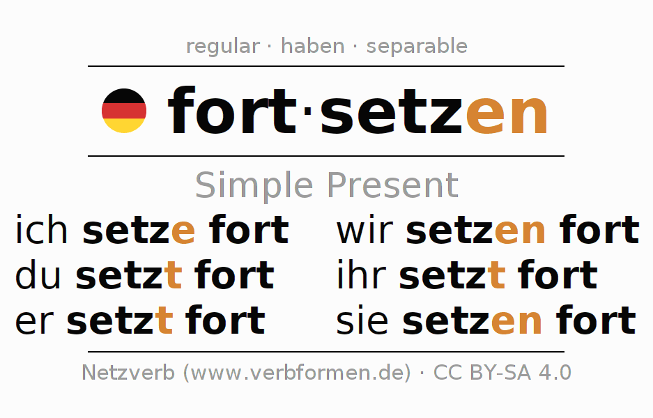 The conjugation of fortsetzen (continue, carry on) in the present tense is: ich setze fort, du setzt fort, er setzt fort, wir setzen fort, ihr setzt fort, sie setzen fort. For this purpose, the endings -e, -t, -t, -en, -t, -en are appended to the stem setz. The ending in the second person singular is shortened by "s", since the stem already ends on -z. The prefix fort- of fortsetzen is separated.The formation of the forms corresponds to the grammatical rules for the conjugation of the verbs in the present tense. Comments ☆