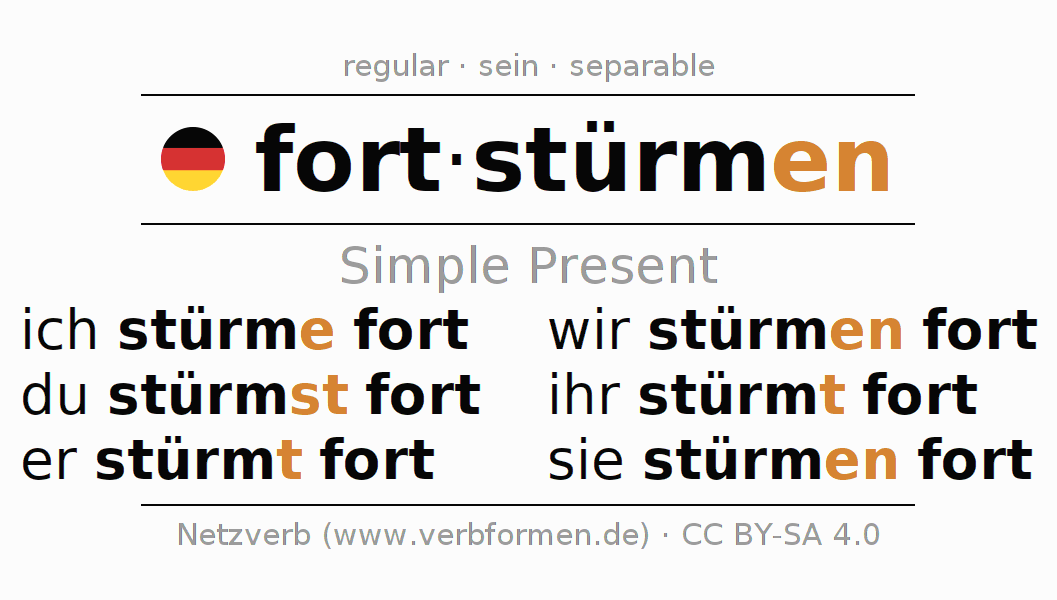 The verb fortstürmen fully conjugated in all persons and numbers in the Present Indicative
