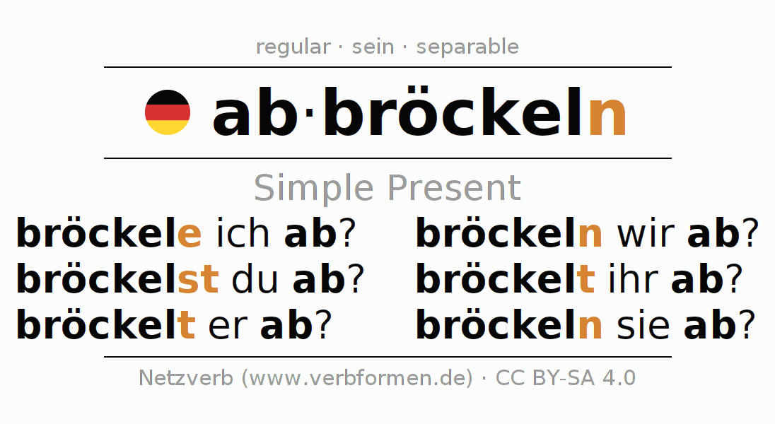 The verb abbröckeln (ist) fully conjugated in all persons and numbers in the Present Indicative