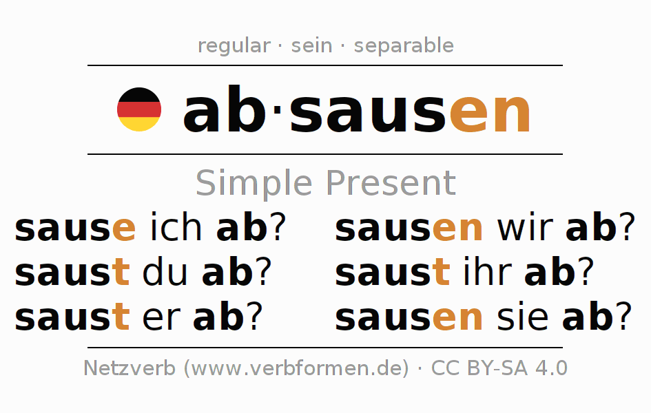 The conjugation of absausen in Present Indicative Presence Active is sause ich ab?, saust du ab?, saust er ab?, sausen wir ab?, saust ihr ab?, sausen sie ab?.The conjugation corresponds to certain grammatical rules. Likewise the requirements for the conjugation of the simple verb forms of absausen in Present. Comments ☆