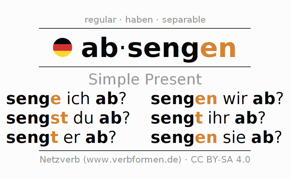 The conjugation of absengen in Present Indicative Presence Active is senge ich ab?, sengst du ab?, sengt er ab?, sengen wir ab?, sengt ihr ab?, sengen sie ab?.The conjugation corresponds to certain grammatical rules. Likewise the requirements for the conjugation of the simple verb forms of absengen in Present. Comments ☆