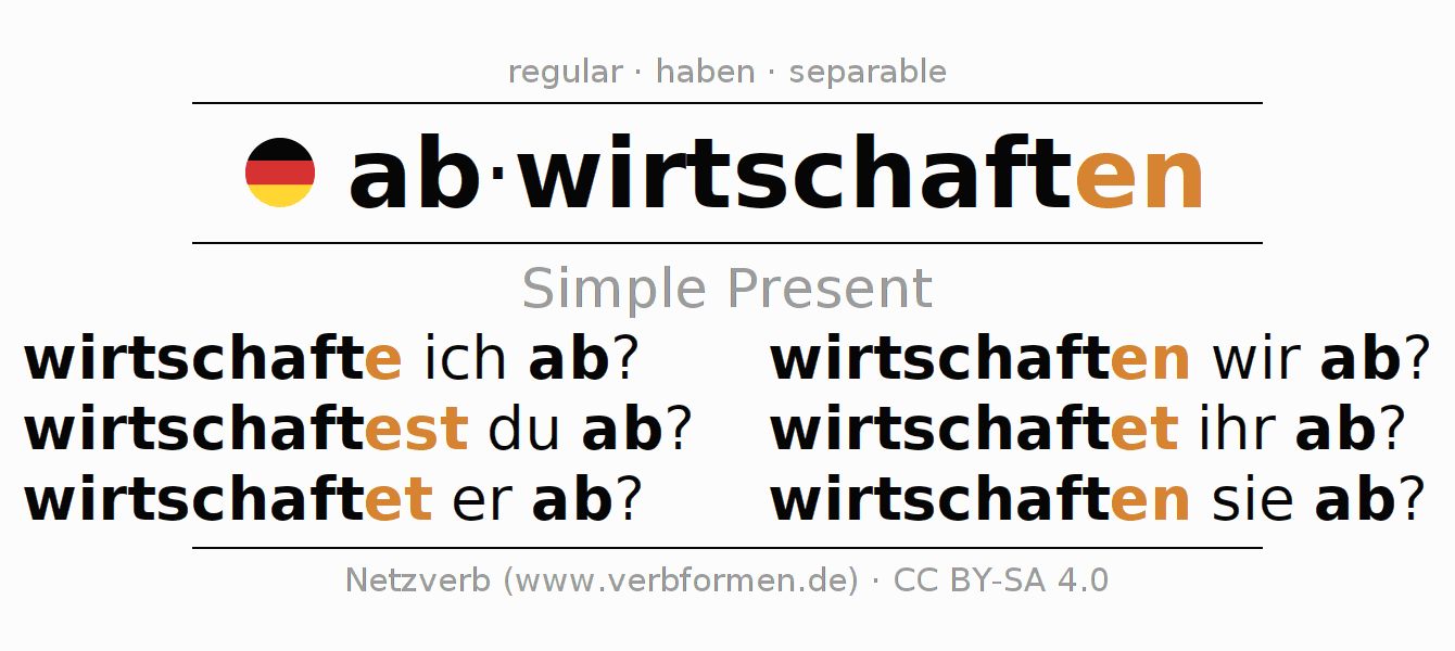 The conjugation of abwirtschaften in Present Indicative Presence Active is wirtschafte ich ab?, wirtschaftest du ab?, wirtschaftet er ab?, wirtschaften wir ab?, wirtschaftet ihr ab?, wirtschaften sie ab?.The conjugation corresponds to certain grammatical rules. Likewise the requirements for the conjugation of the simple verb forms of abwirtschaften in Present. Comments ☆