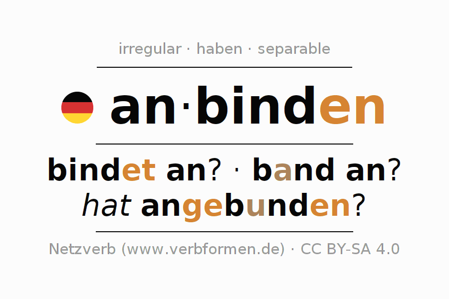 The conjugation of anbinden in Present Indicative Presence Active is binde ich an?, bindest du an?, bindet er an?, binden wir an?, bindet ihr an?, binden sie an?.The conjugation corresponds to certain grammatical rules. Likewise the requirements for the conjugation of the simple verb forms of anbinden in Present. Comments ☆