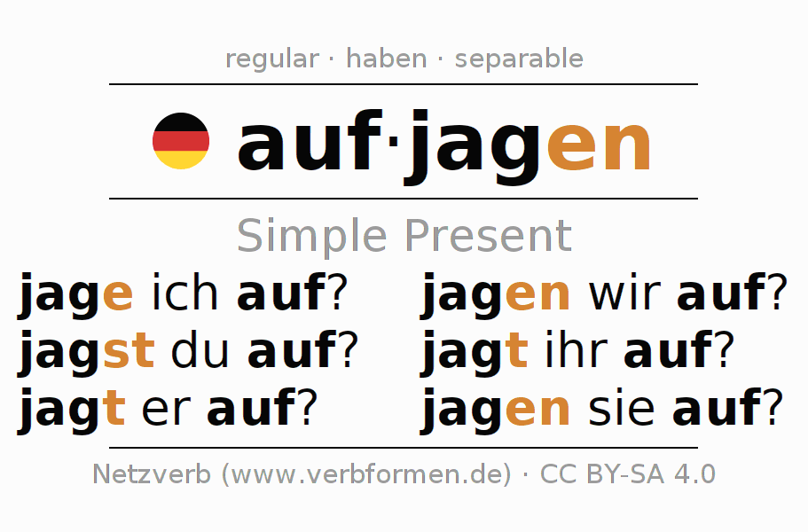 The conjugation of aufjagen in Present Indicative Presence Active is jage ich auf?, jagst du auf?, jagt er auf?, jagen wir auf?, jagt ihr auf?, jagen sie auf?.The conjugation corresponds to certain grammatical rules. Likewise the requirements for the conjugation of the simple verb forms of aufjagen in Present. Comments ☆