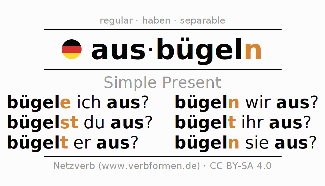 The conjugation of ausbügeln in Present Indicative Presence Active is büg(e)le ich aus?, bügelst du aus?, bügelt er aus?, bügeln wir aus?, bügelt ihr aus?, bügeln sie aus?.The conjugation corresponds to certain grammatical rules. Likewise the requirements for the conjugation of the simple verb forms of ausbügeln in Present. Comments ☆