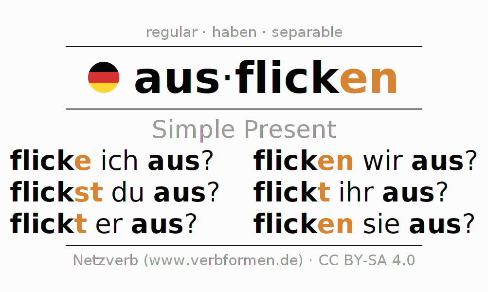 The conjugation of ausflicken in Present Indicative Presence Active is flicke ich aus?, flickst du aus?, flickt er aus?, flicken wir aus?, flickt ihr aus?, flicken sie aus?.The conjugation corresponds to certain grammatical rules. Likewise the requirements for the conjugation of the simple verb forms of ausflicken in Present. Comments ☆