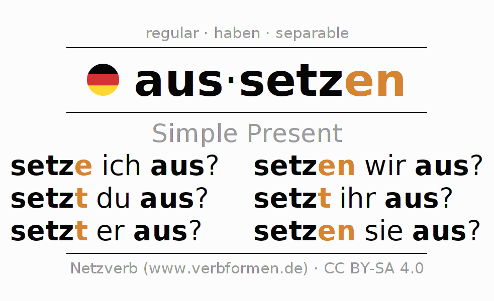 The conjugation of aussetzen in Present Indicative Presence Active is setze ich aus?, setzt du aus?, setzt er aus?, setzen wir aus?, setzt ihr aus?, setzen sie aus?.The conjugation corresponds to certain grammatical rules. Likewise the requirements for the conjugation of the simple verb forms of aussetzen in Present. Comments ☆