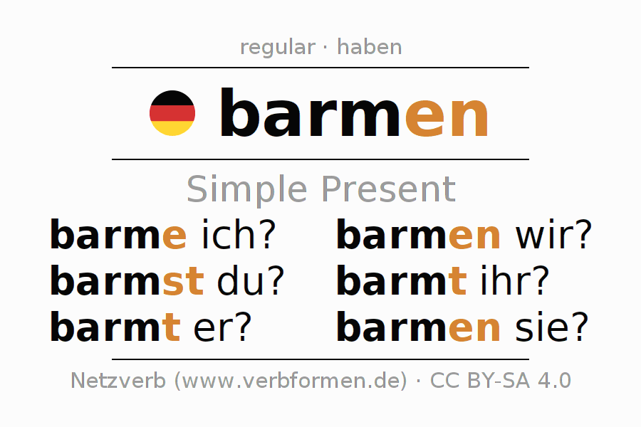 The conjugation of barmen in Present Indicative Presence Active is barme ich?, barmst du?, barmt er?, barmen wir?, barmt ihr?, barmen sie?.The conjugation corresponds to certain grammatical rules. Likewise the requirements for the conjugation of the simple verb forms of barmen in Present. Comments ☆
