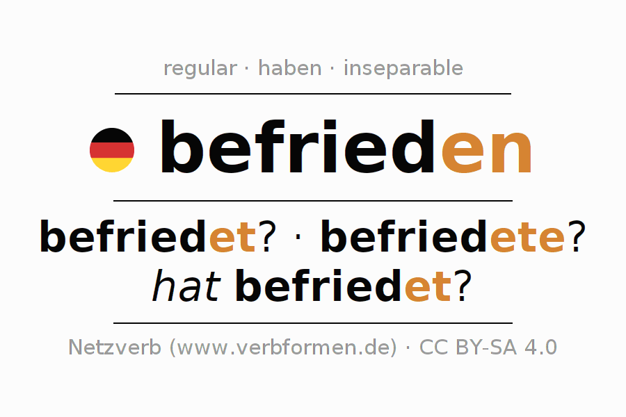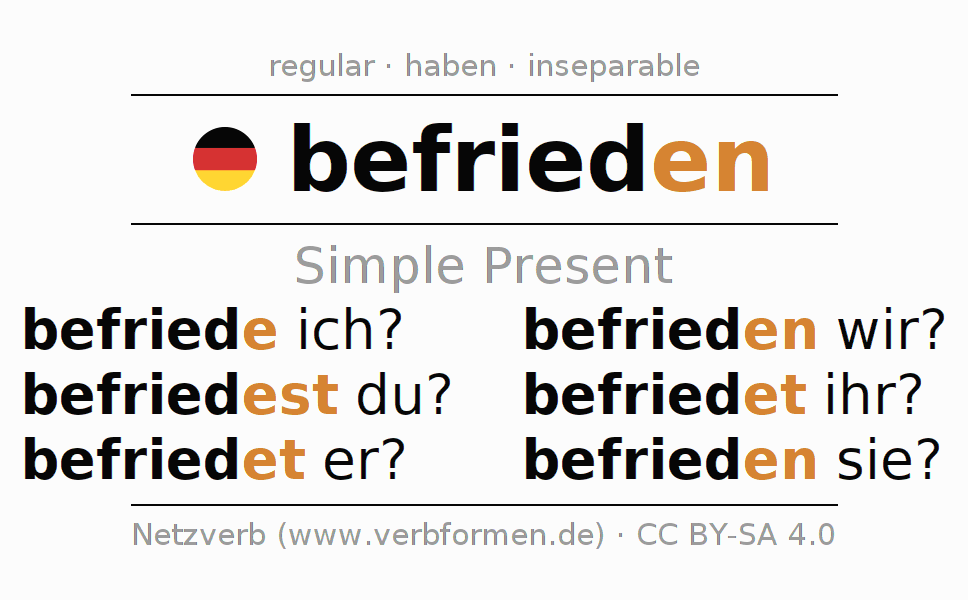 The conjugation of befrieden in Present Indicative Presence Active is befriede ich?, befriedest du?, befriedet er?, befrieden wir?, befriedet ihr?, befrieden sie?.The conjugation corresponds to certain grammatical rules. Likewise the requirements for the conjugation of the simple verb forms of befrieden in Present. Comments ☆