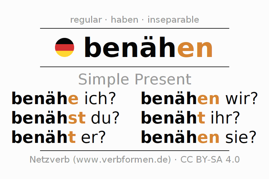 The verb benähen fully conjugated in all persons and numbers in the Present Indicative
