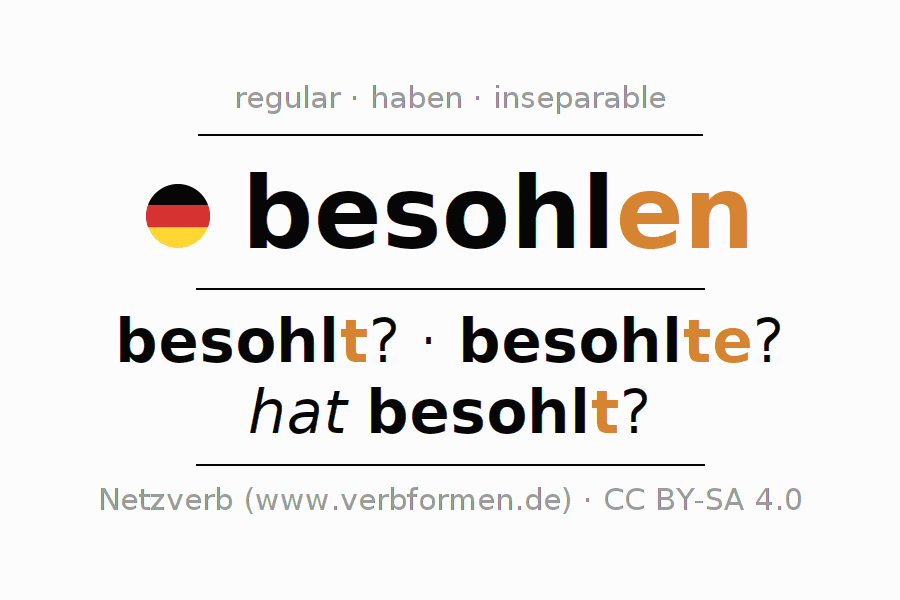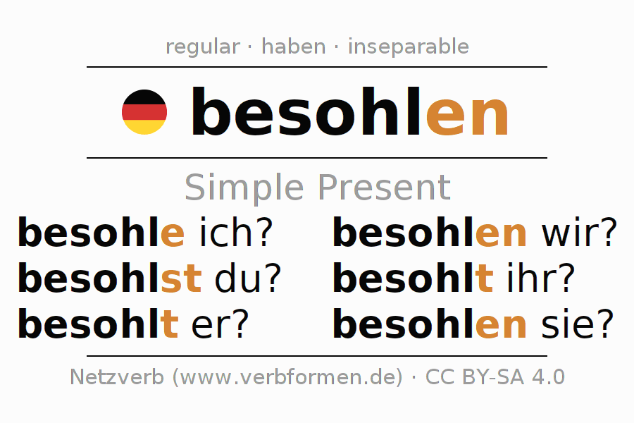 The conjugation of besohlen in Present Indicative Presence Active is besohle ich?, besohlst du?, besohlt er?, besohlen wir?, besohlt ihr?, besohlen sie?.The conjugation corresponds to certain grammatical rules. Likewise the requirements for the conjugation of the simple verb forms of besohlen in Present. Comments ☆