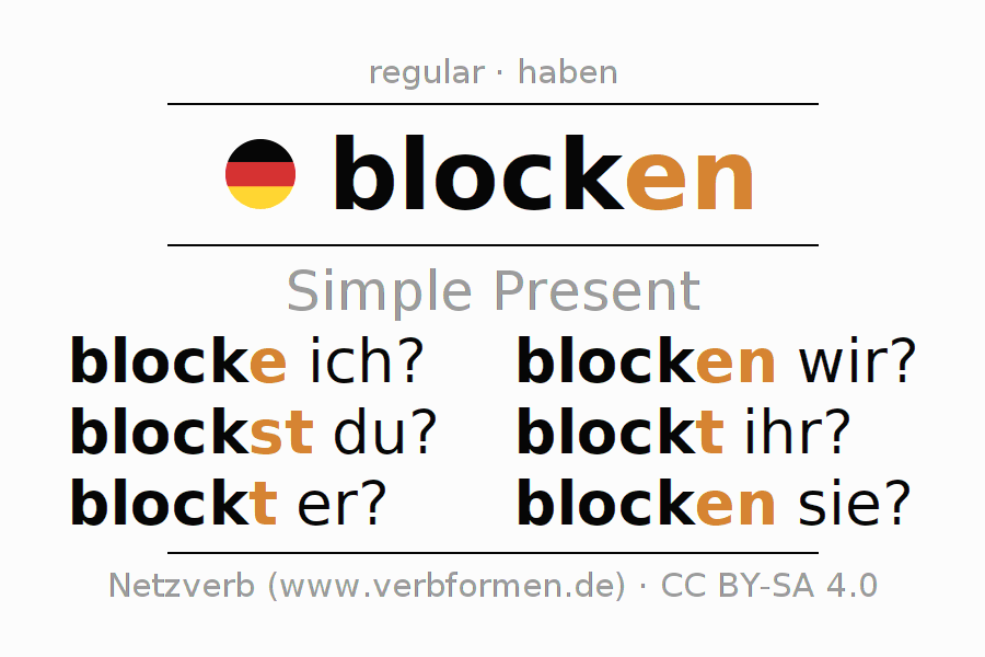 The verb blocken fully conjugated in all persons and numbers in the Present Indicative