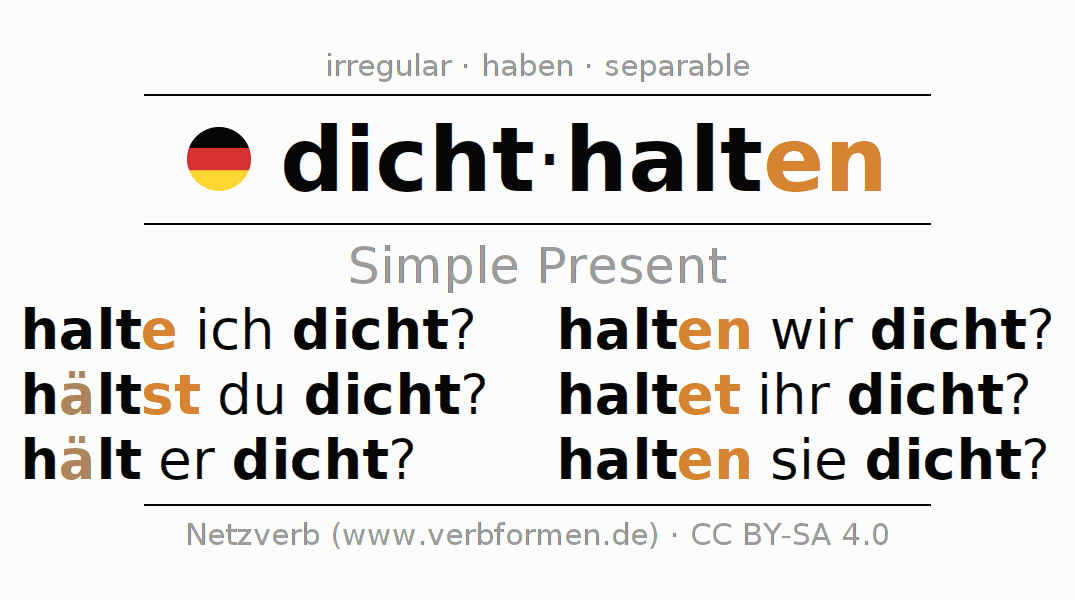 The conjugation of dichthalten in Present Indicative Presence Active is halte ich dicht?, hältst du dicht?, hält er dicht?, halten wir dicht?, haltet ihr dicht?, halten sie dicht?.The conjugation corresponds to certain grammatical rules. Likewise the requirements for the conjugation of the simple verb forms of dichthalten in Present. Comments ☆