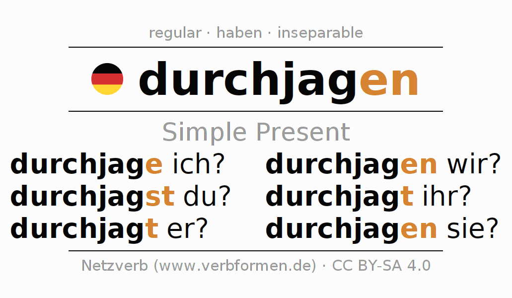 The conjugation of durchjagen in Present Indicative Presence Active is durchjage ich?, durchjagst du?, durchjagt er?, durchjagen wir?, durchjagt ihr?, durchjagen sie?.The conjugation corresponds to certain grammatical rules. Likewise the requirements for the conjugation of the simple verb forms of durchjagen in Present. Comments ☆