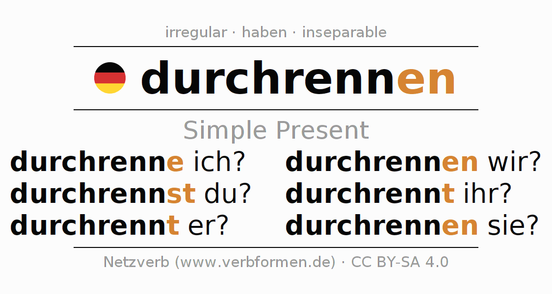 The conjugation of durchrennen in Present Indicative Presence Active is durchrenne ich?, durchrennst du?, durchrennt er?, durchrennen wir?, durchrennt ihr?, durchrennen sie?.The conjugation corresponds to certain grammatical rules. Likewise the requirements for the conjugation of the simple verb forms of durchrennen in Present. Comments ☆