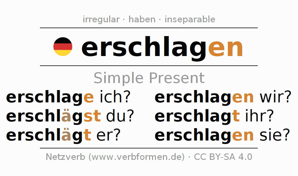 The conjugation of erschlagen in Present Indicative Presence Active is erschlage ich?, erschlägst du?, erschlägt er?, erschlagen wir?, erschlagt ihr?, erschlagen sie?.The conjugation corresponds to certain grammatical rules. Likewise the requirements for the conjugation of the simple verb forms of erschlagen in Present. Comments ☆
