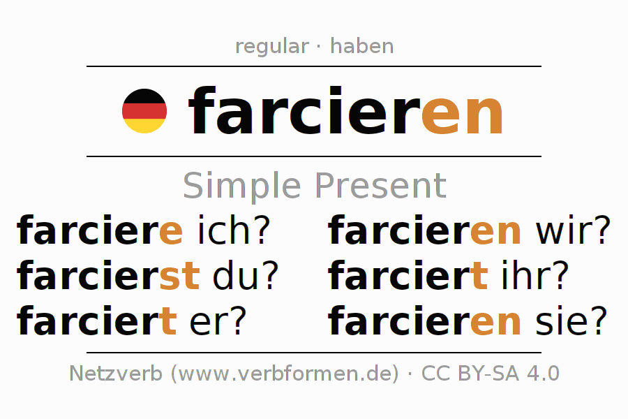 The conjugation of farcieren in Present Indicative Presence Active is farciere ich?, farcierst du?, farciert er?, farcieren wir?, farciert ihr?, farcieren sie?.The conjugation corresponds to certain grammatical rules. Likewise the requirements for the conjugation of the simple verb forms of farcieren in Present. Comments ☆