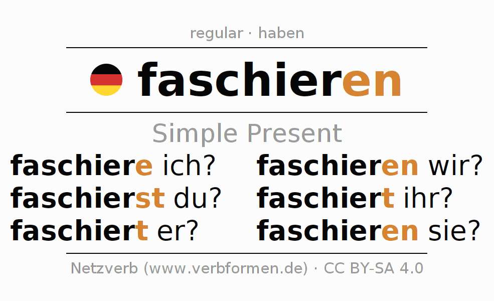 The conjugation of faschieren in Present Indicative Presence Active is faschiere ich?, faschierst du?, faschiert er?, faschieren wir?, faschiert ihr?, faschieren sie?.The conjugation corresponds to certain grammatical rules. Likewise the requirements for the conjugation of the simple verb forms of faschieren in Present. Comments ☆