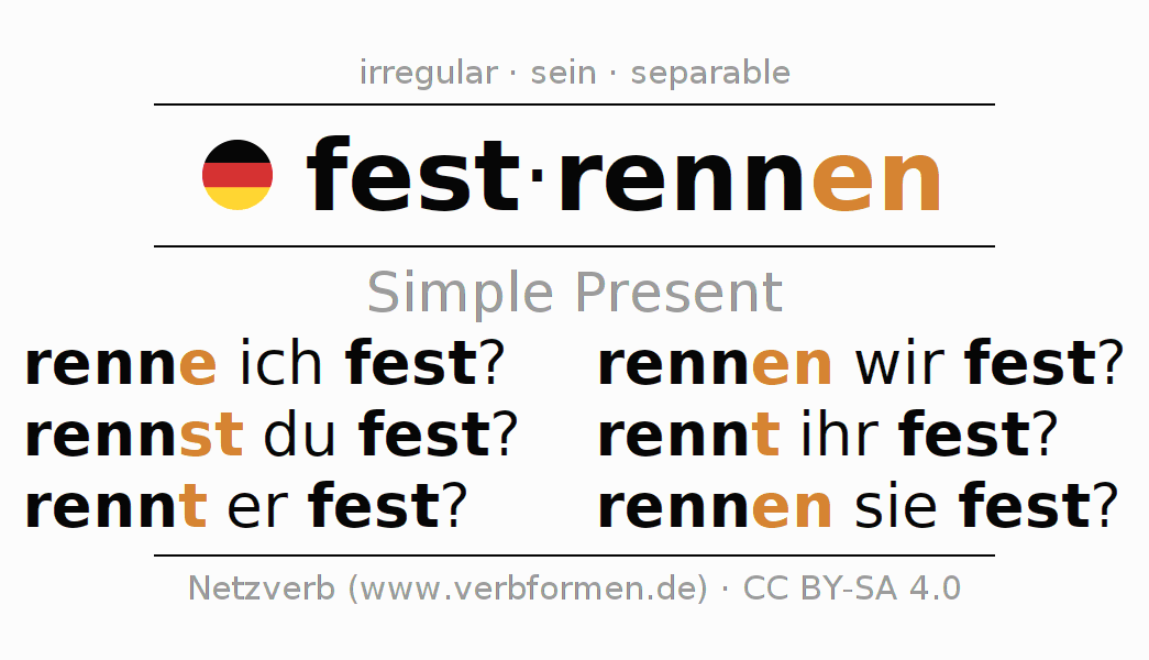 The conjugation of festrennen in Present Indicative Presence Active is renne ich fest?, rennst du fest?, rennt er fest?, rennen wir fest?, rennt ihr fest?, rennen sie fest?.The conjugation corresponds to certain grammatical rules. Likewise the requirements for the conjugation of the simple verb forms of festrennen in Present. Comments ☆