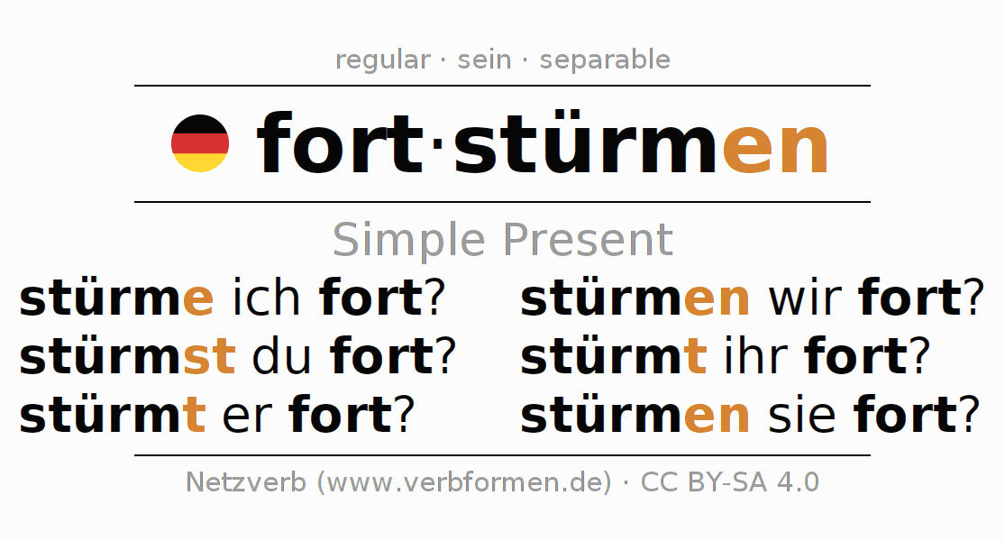 The verb fortstürmen fully conjugated in all persons and numbers in the Present Indicative