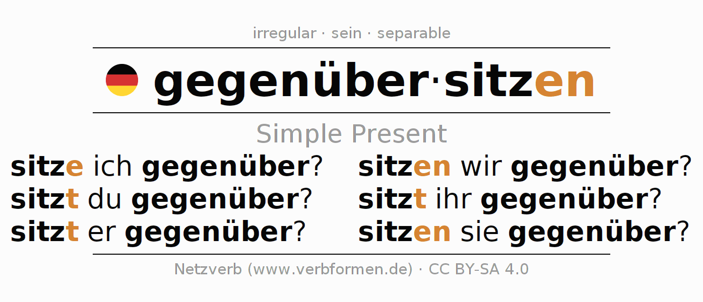 The conjugation of gegenübersitzen in Present Indicative Presence Active is sitze ich gegenüber?, sitzt du gegenüber?, sitzt er gegenüber?, sitzen wir gegenüber?, sitzt ihr gegenüber?, sitzen sie gegenüber?.The conjugation corresponds to certain grammatical rules. Likewise the requirements for the conjugation of the simple verb forms of gegenübersitzen in Present. Comments ☆