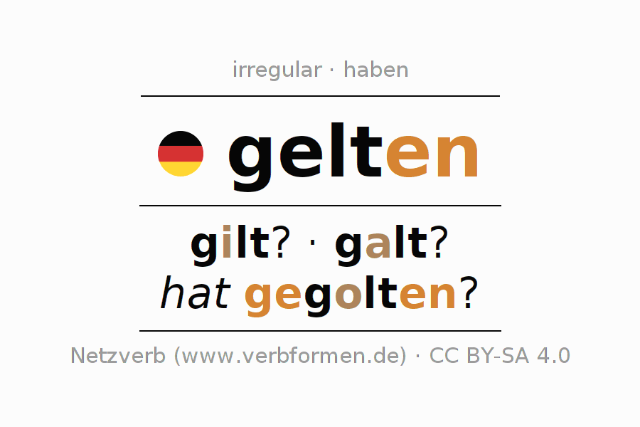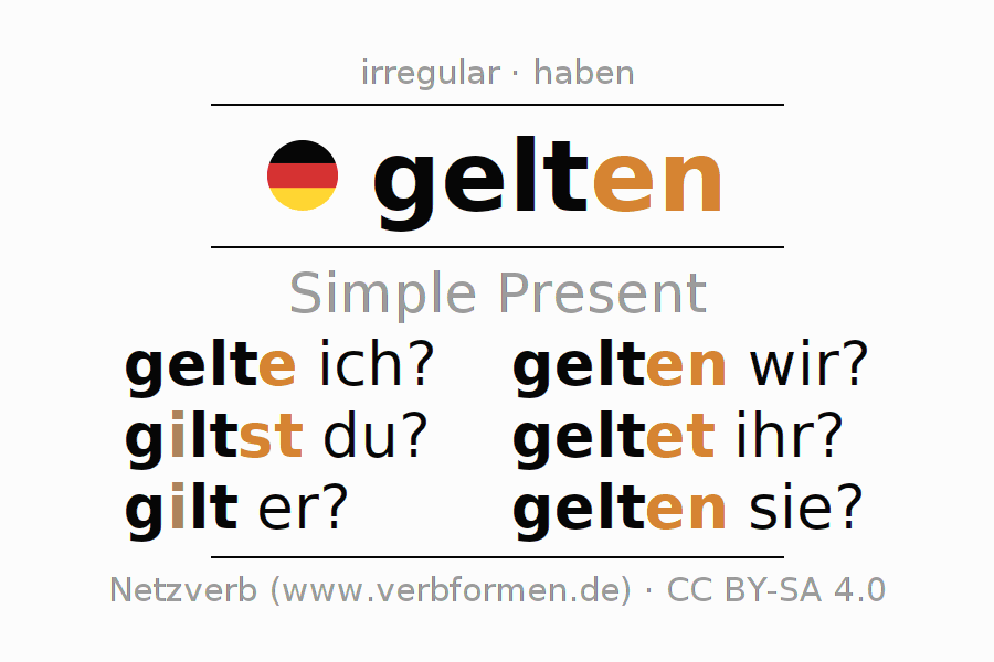 The verb gelten fully conjugated in all persons and numbers in the Present Indicative