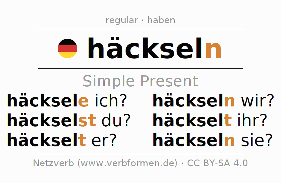 The verb häckseln fully conjugated in all persons and numbers in the Present Indicative