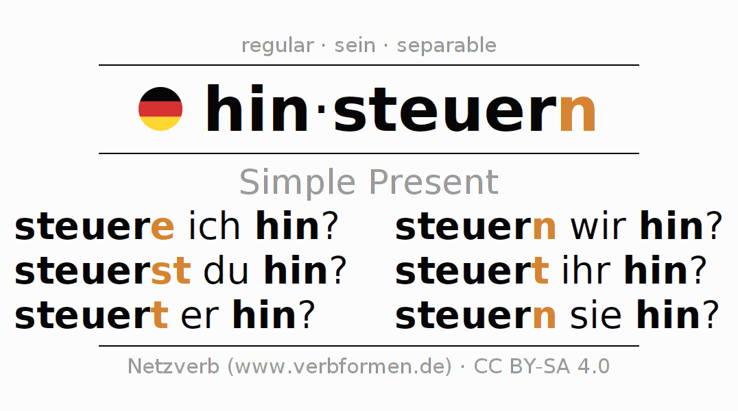The conjugation of hinsteuern in Present Indicative Presence Active is steu(e)re ich hin?, steuerst du hin?, steuert er hin?, steuern wir hin?, steuert ihr hin?, steuern sie hin?.The conjugation corresponds to certain grammatical rules. Likewise the requirements for the conjugation of the simple verb forms of hinsteuern in Present. Comments ☆