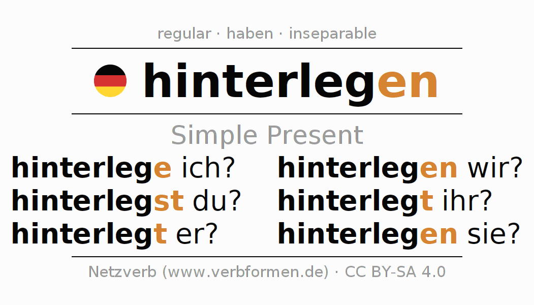 The verb hinterlegen fully conjugated in all persons and numbers in the Present Indicative