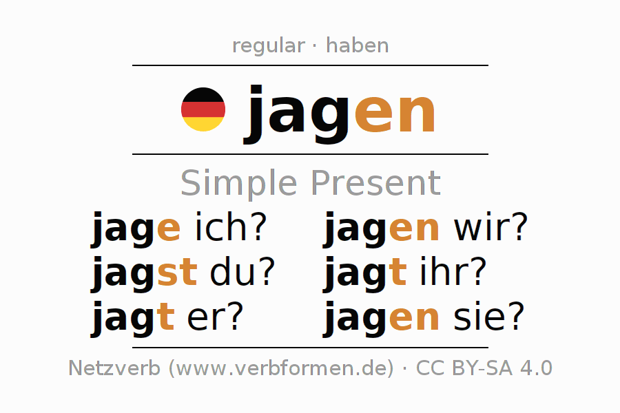 The conjugation of jagen in Present Indicative Presence Active is jage ich?, jagst du?, jagt er?, jagen wir?, jagt ihr?, jagen sie?.The conjugation corresponds to certain grammatical rules. Likewise the requirements for the conjugation of the simple verb forms of jagen in Present. 1Comment ☆4.0