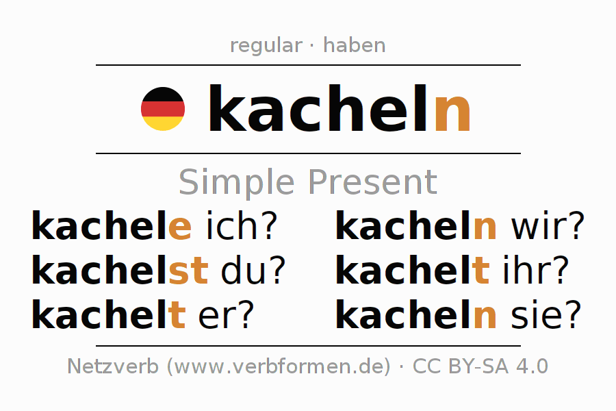 The conjugation of kacheln in Present Indicative Presence Active is kach(e)le ich?, kachelst du?, kachelt er?, kacheln wir?, kachelt ihr?, kacheln sie?.The conjugation corresponds to certain grammatical rules. Likewise the requirements for the conjugation of the simple verb forms of kacheln in Present. Comments ☆