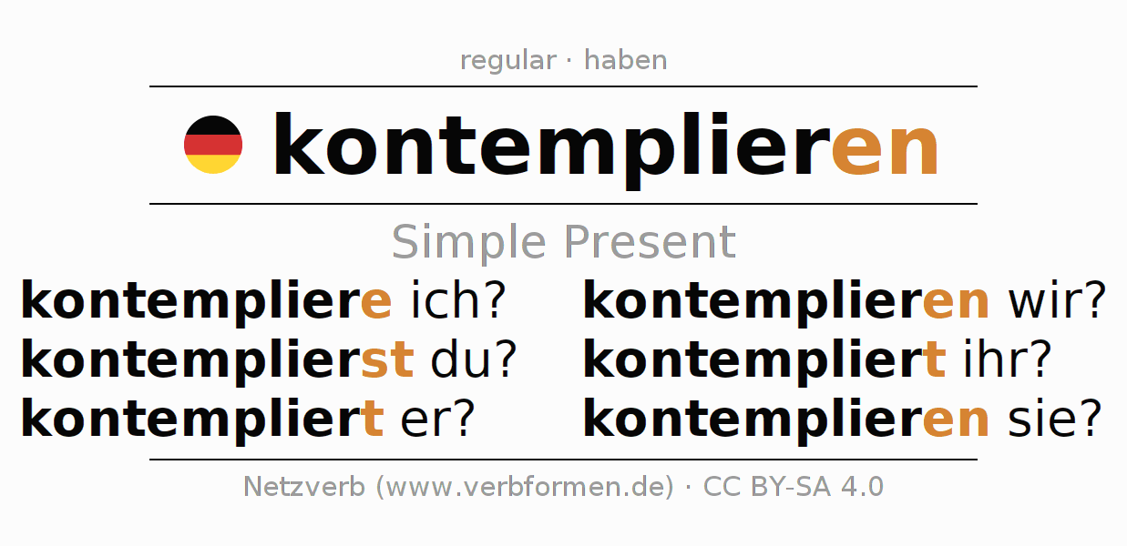 The conjugation of kontemplieren in Present Indicative Presence Active is kontempliere ich?, kontemplierst du?, kontempliert er?, kontemplieren wir?, kontempliert ihr?, kontemplieren sie?.The conjugation corresponds to certain grammatical rules. Likewise the requirements for the conjugation of the simple verb forms of kontemplieren in Present. Comments ☆