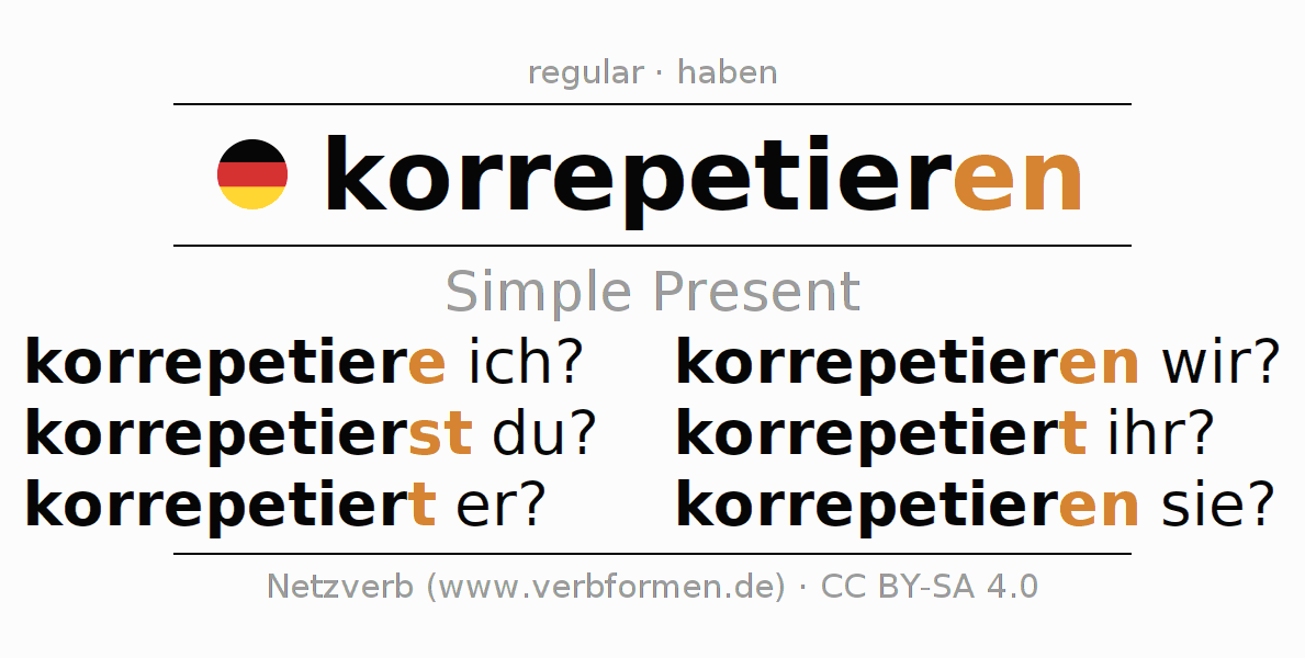 The verb korrepetieren fully conjugated in all persons and numbers in the Present Indicative