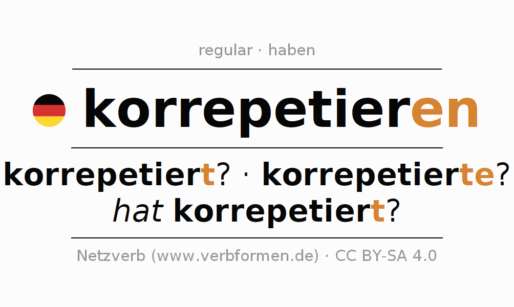 The conjugation of korrepetieren in Present Indicative Presence Active is korrepetiere ich?, korrepetierst du?, korrepetiert er?, korrepetieren wir?, korrepetiert ihr?, korrepetieren sie?.The conjugation corresponds to certain grammatical rules. Likewise the requirements for the conjugation of the simple verb forms of korrepetieren in Present. Comments ☆