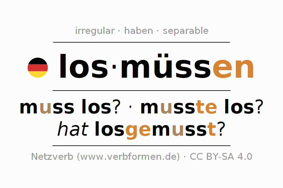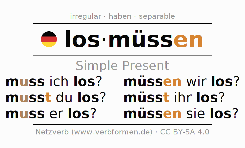 The conjugation of losmüssen in Present Indicative Presence Active is muss ich los?, musst du los?, muss er los?, müssen wir los?, müsst ihr los?, müssen sie los?.The conjugation corresponds to certain grammatical rules. Likewise the requirements for the conjugation of the simple verb forms of losmüssen in Present. Comments ☆