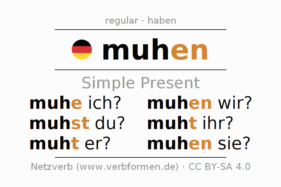 The conjugation of muhen in Present Indicative Presence Active is muhe ich?, muhst du?, muht er?, muhen wir?, muht ihr?, muhen sie?.The conjugation corresponds to certain grammatical rules. Likewise the requirements for the conjugation of the simple verb forms of muhen in Present. Comments ☆