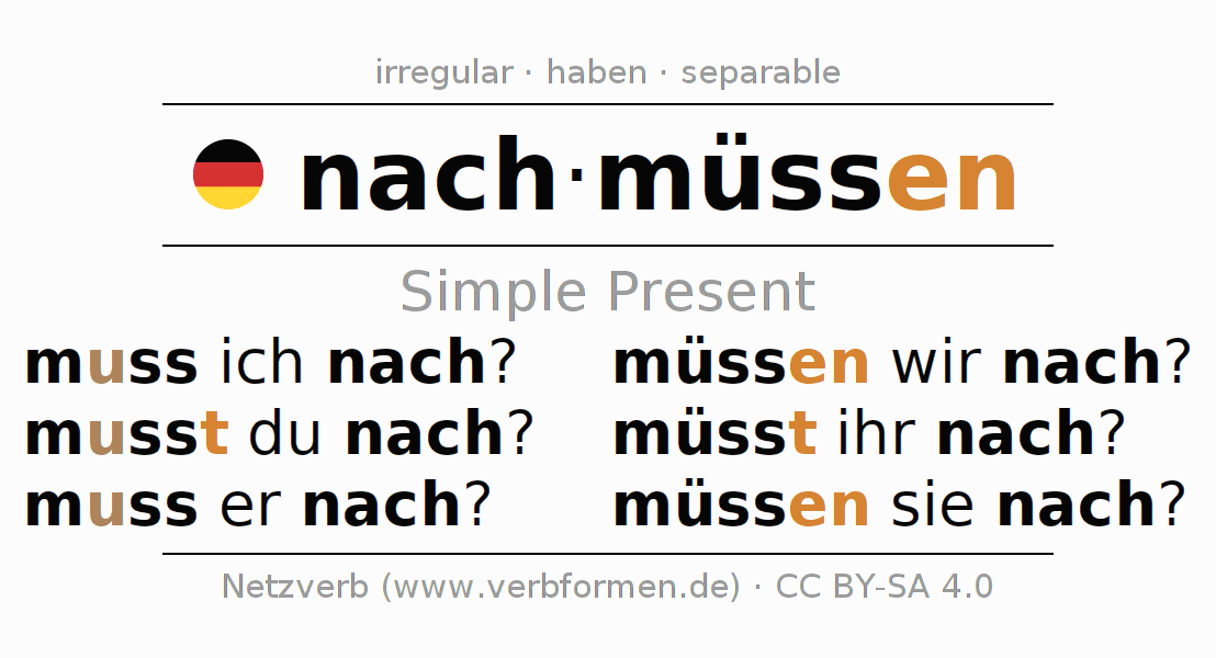 The conjugation of nachmüssen in Present Indicative Presence Active is muss ich nach?, musst du nach?, muss er nach?, müssen wir nach?, müsst ihr nach?, müssen sie nach?.The conjugation corresponds to certain grammatical rules. Likewise the requirements for the conjugation of the simple verb forms of nachmüssen in Present. Comments ☆