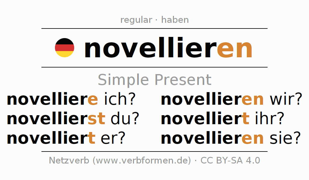 The conjugation of novellieren in Present Indicative Presence Active is novelliere ich?, novellierst du?, novelliert er?, novellieren wir?, novelliert ihr?, novellieren sie?.The conjugation corresponds to certain grammatical rules. Likewise the requirements for the conjugation of the simple verb forms of novellieren in Present. Comments ☆
