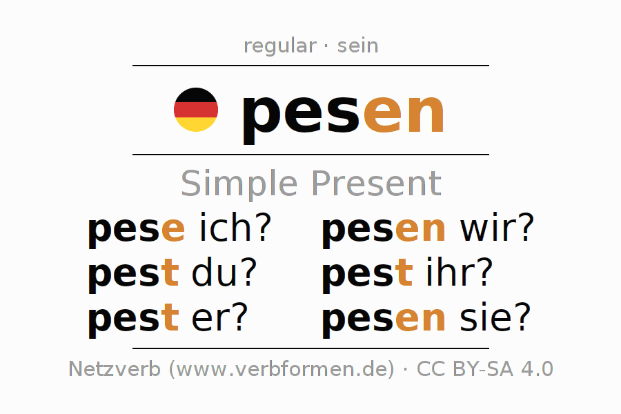 The conjugation of pesen in Present Indicative Presence Active is pese ich?, pest du?, pest er?, pesen wir?, pest ihr?, pesen sie?.The conjugation corresponds to certain grammatical rules. Likewise the requirements for the conjugation of the simple verb forms of pesen in Present. Comments ☆
