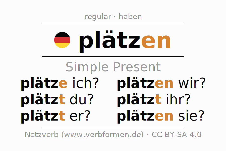 The conjugation of plätzen in Present Indicative Presence Active is plätze ich?, plätzt du?, plätzt er?, plätzen wir?, plätzt ihr?, plätzen sie?.The conjugation corresponds to certain grammatical rules. Likewise the requirements for the conjugation of the simple verb forms of plätzen in Present. Comments ☆