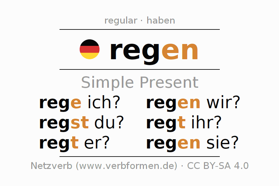 The conjugation of regen in Present Indicative Presence Active is rege ich?, regst du?, regt er?, regen wir?, regt ihr?, regen sie?.The conjugation corresponds to certain grammatical rules. Likewise the requirements for the conjugation of the simple verb forms of regen in Present. Comments ☆