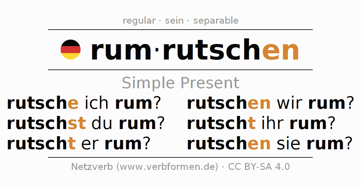 The conjugation of rumrutschen in Present Indicative Presence Active is rutsche ich rum?, rutschst du rum?, rutscht er rum?, rutschen wir rum?, rutscht ihr rum?, rutschen sie rum?.The conjugation corresponds to certain grammatical rules. Likewise the requirements for the conjugation of the simple verb forms of rumrutschen in Present. Comments ☆