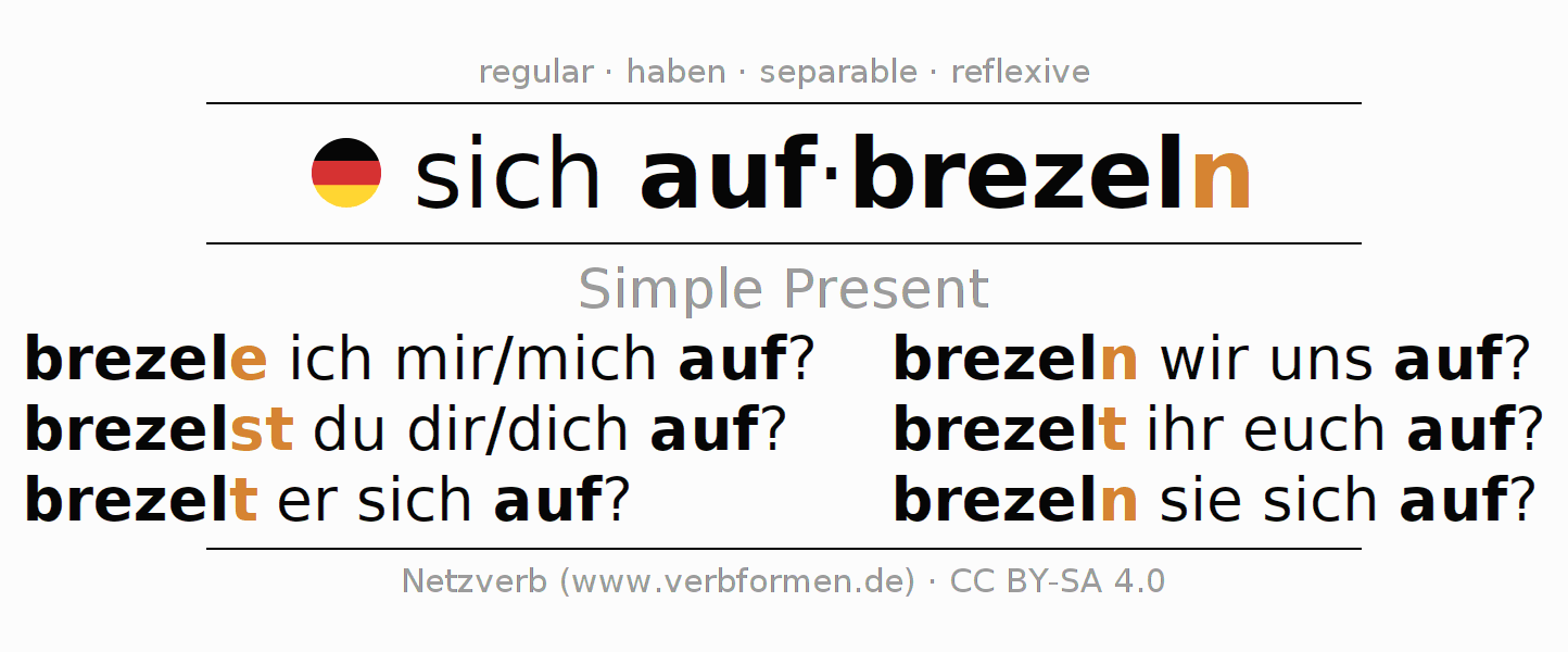 The conjugation of sich aufbrezeln in Present Indicative Presence Active is brez(e)le ich mir/mich auf?, brezelst du dir/dich auf?, brezelt er sich auf?, brezeln wir uns auf?, brezelt ihr euch auf?, brezeln sie sich auf?.The conjugation corresponds to certain grammatical rules. Likewise the requirements for the conjugation of the simple verb forms of aufbrezeln in Present. Comments ☆