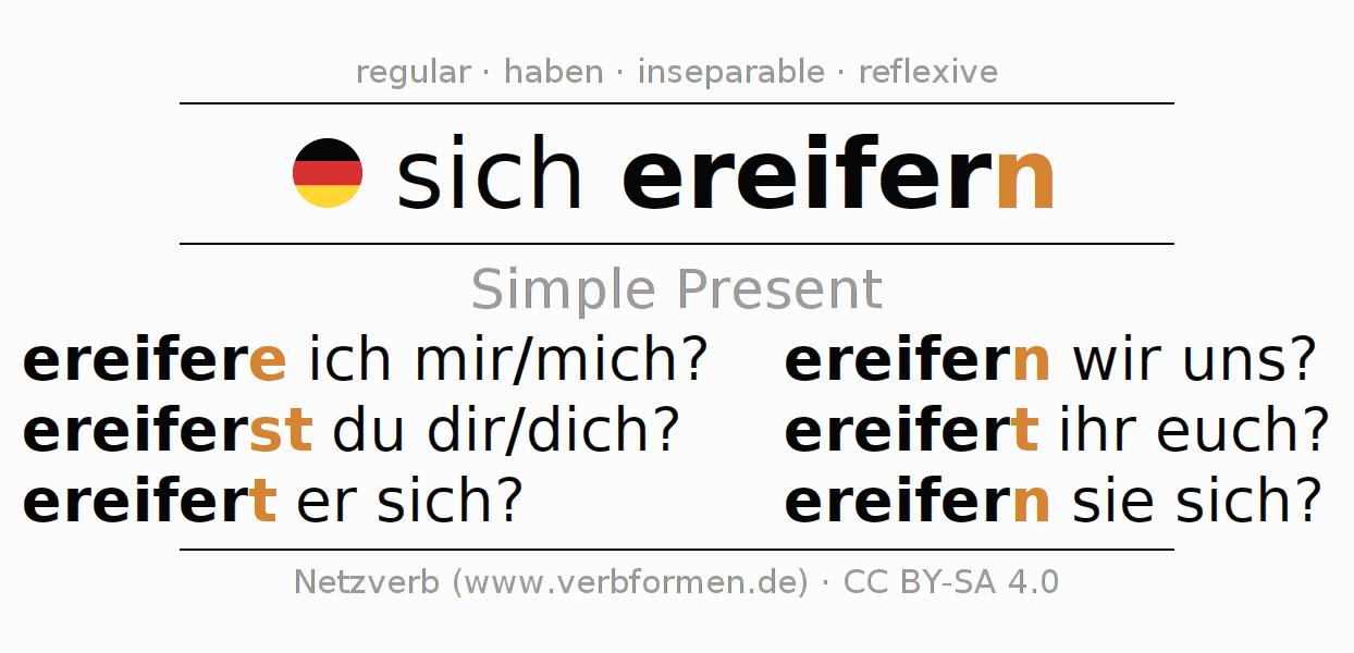 The verb sich ereifern fully conjugated in all persons and numbers in the Present Indicative